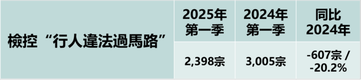 疫情緩和後,隨著來澳旅客數量的回升,行人交通違規的情況明顯增加。在警方的嚴格執法及大力宣教下,相關違規情況已漸見改善,今年第一季“行人違法過馬路”共有2,398宗,較去年同期減少607宗,下降百分之20.2。未來,警方將繼續透過多種管道發佈交通安全資訊,提醒公眾需遵守本澳的交通法規,並持續加強對交通事故及違規行為高發地點的巡查工作,以保障本澳的交通秩序及公眾的出行安全。