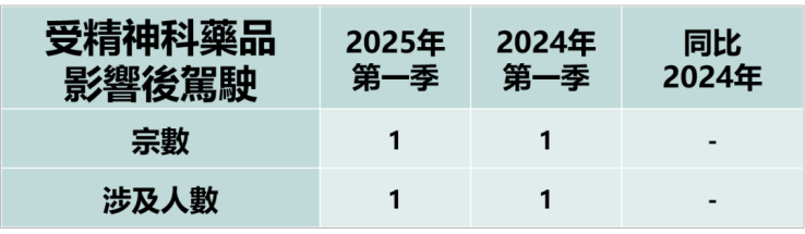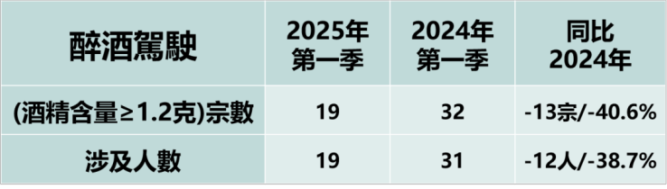 今年第一季檢控醉酒駕駛共19宗,較2024年同期減少13宗,下降百分之40.6。
