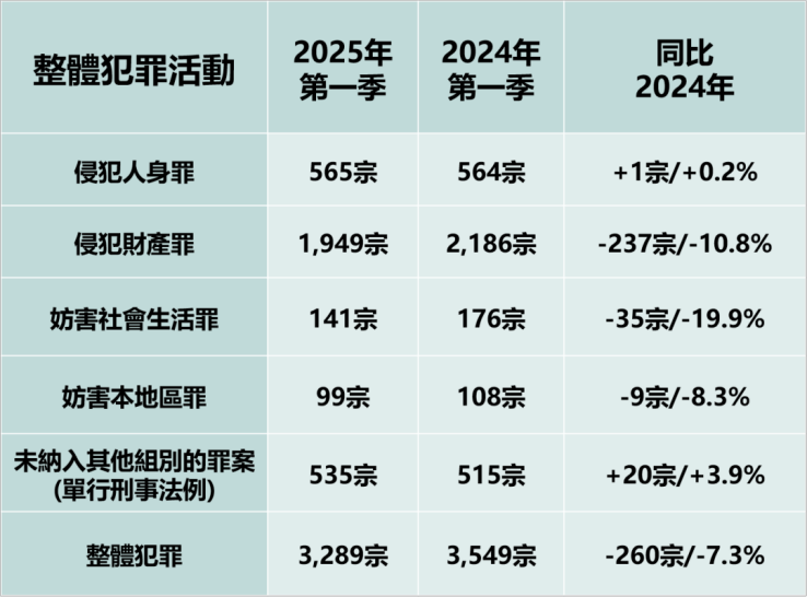 2025年第一季本澳警方共開立刑事專案調查案件3,289宗,較2024年同期減少260宗,下降百分之7.3。