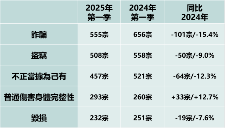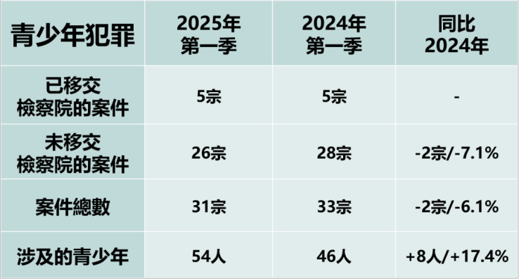 今年第一季青少年犯罪案件共31宗,較2024年同期減少2宗,下降百分之6.1;涉及的青少年共54人,較2024年同期增加8人,上升百分之17.4。