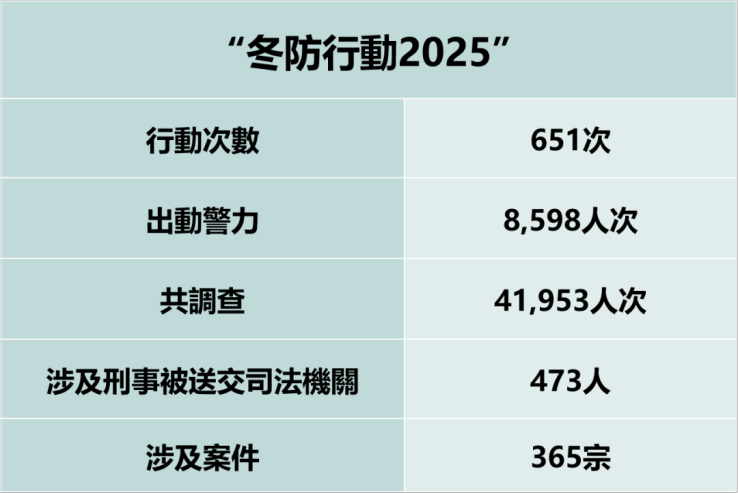 2025年農曆新年期間,員警總局統籌治安警察局和司法警察局,並聯同澳門海關開展了“冬防”行動,共進行651次巡查,動用警力8,598人次,調查41,953人次,其中473人因觸犯刑事案件而送交司法機關處理,涉及案件365宗。
