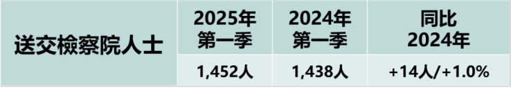 今年首季警方調查犯罪及警務行動期間,共有1,452人被拘留及送交檢察院處理,比2024年同期增加14人,微升百分之1。