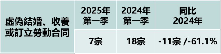 俗稱“假結婚”的虛偽結婚案件共7宗,比2024年第一季大幅減少11宗。警方將繼續強化與身份證明局及周邊地區警方的聯繫與協作,對懷疑個案進行深入調查,重點打擊相關犯罪集團及違法仲介,同時循多管道進行宣傳,提醒公眾切勿實施相關犯罪行為。