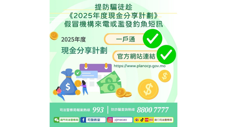 鑒於去年曾有騙徒冒充“現金分享計畫中心”人員來電,訛稱事主的現金分享資格已被取消,借此誘導居民提供個人及銀行資料,甚至要求轉帳。今年,騙徒極可能會故技重施,並透過濫發附有虛假連結的釣魚短訊,騙取個人資料或財產,因此居民務必提高警惕,謹慎防範。