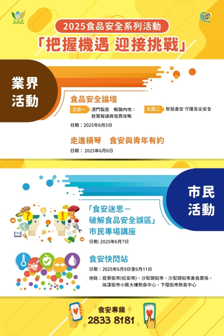 市政署誠邀業界、市民參與系列食安活動,共同提升澳門食安水準、促進產業進一步發展。如對活動有任何查詢,可於辦公時間致電食安專線2833 8181查詢。