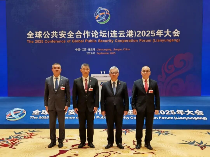 保安司司長黃少澤(右二)、員警總局局長梁文昌(左二)、局長助理魏瑞斌(左一)以及保安司司長辦公室顧問黃超文(右一),出席全球公共安全合作論壇(連雲港)2025年大會