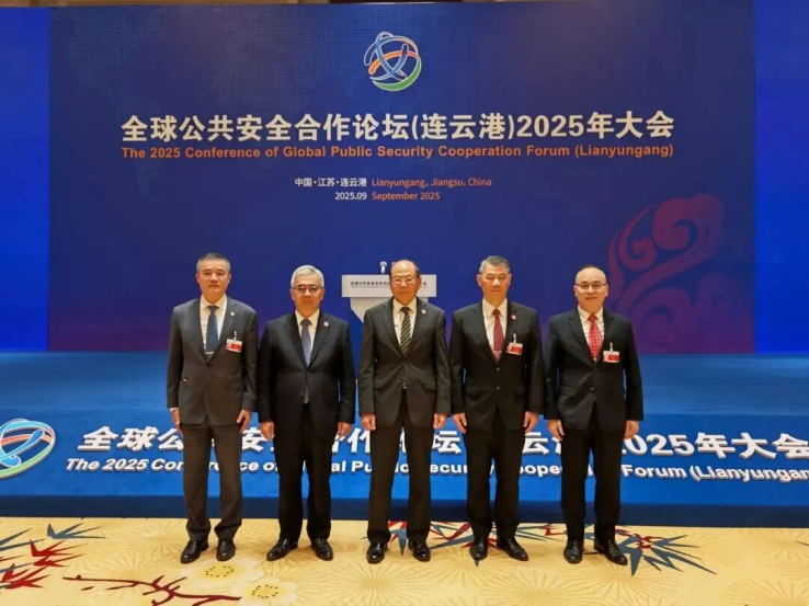 保安司司長黃少澤(左二)率領澳門代表與全球公共安全合作論壇(連雲港)2025年大會主席曾偉雄(中)合影