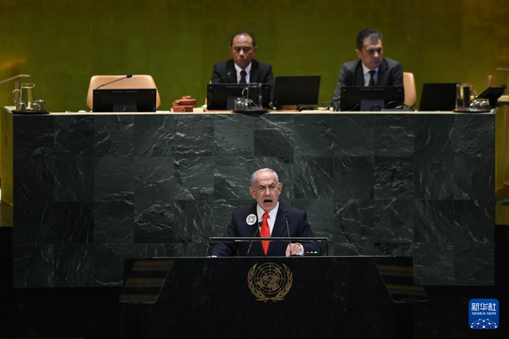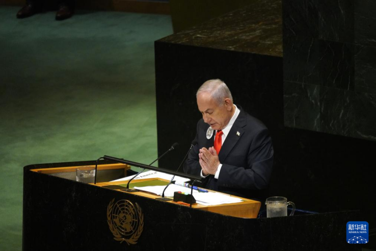 9月26日,在位于纽约的联合国总部,以色列总理内塔尼亚胡在第80届联合国大会一般性辩论发言。众多联合国会员国代表起身离席,退场抗议。 新华社记者李睿摄