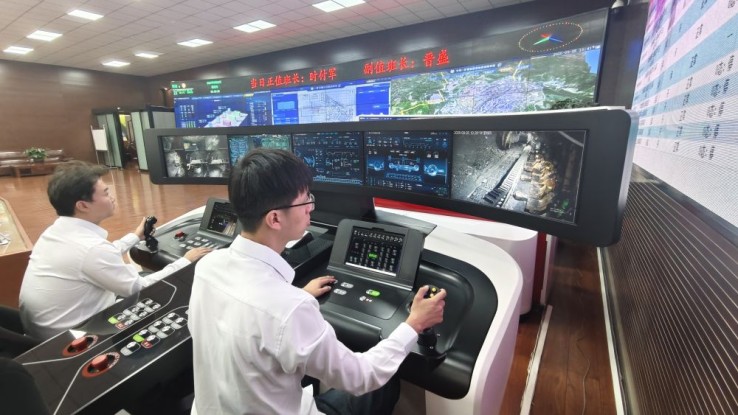 在位於陽泉市的華陽新材料科技集團一礦調度中心,透過大螢幕,可以看到井下割煤機緩緩開動,黑得透亮的煤塊掉落到傳送皮帶上,順著皮帶輸送到地面,井下設備協同運轉一目了然。