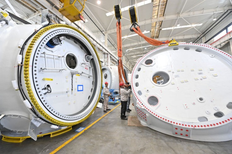 2025年9月24日,工人在位於山西轉型綜合改革示範區的太重集團新能源產業園區吊運風電裝備。新華社記者 楊晨光 攝