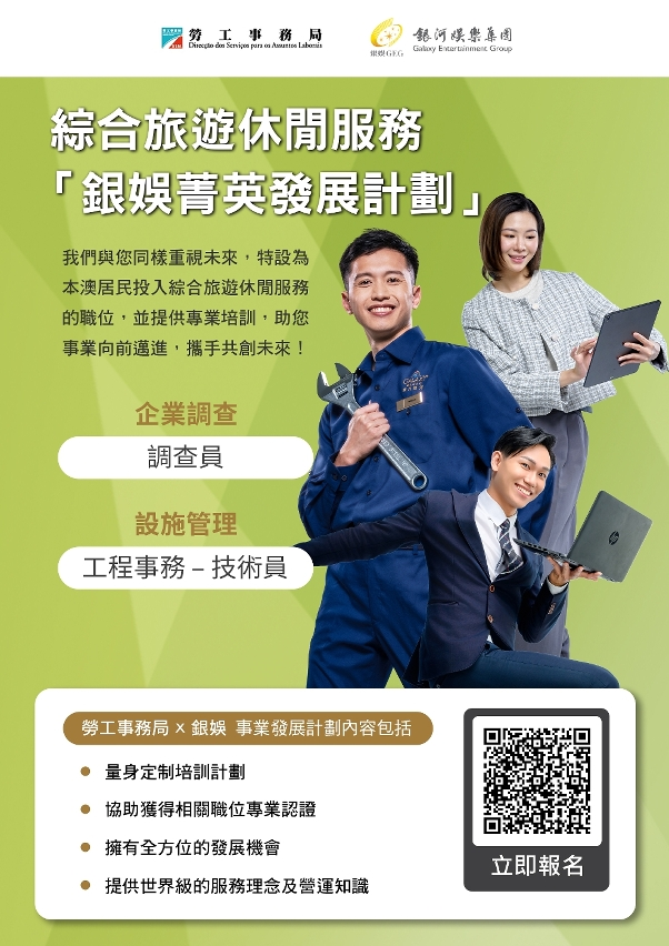本報訊 (記者 黃玉)為支持本地人才全面發展,拓展多元職涯路向,勞工事務局(下稱勞工局)和銀河娛樂集團(下稱銀娛)合作推出銀娛菁英發展計畫(企業調查部及設施管理部)(下稱計畫),以先入職、後培訓方式,為有志投身綜合旅遊休閒服務行業的澳門居民,提供一系列有關企業調查及設施管理的專業培訓及工作實踐機會,計畫由9月26日起接受申請。