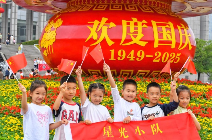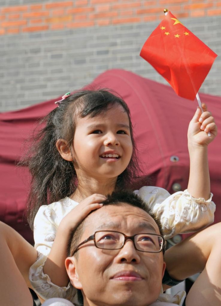 10月1日,在河北省石家莊解放廣場,小朋友在家長陪伴下參加升旗儀式。