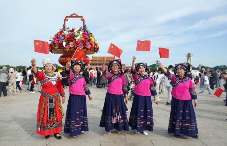 10月1日,來自貴州的遊客在北京天安門廣場遊覽拍照。