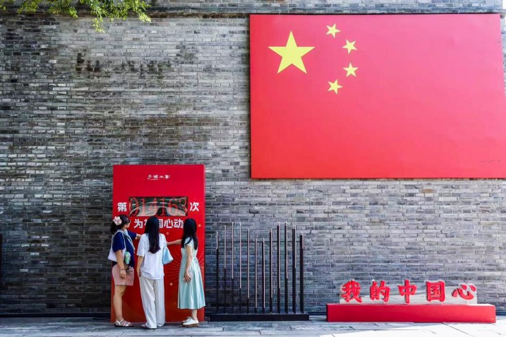 10月1日,在浙江嘉興市南湖區建設街道子城城牆邊,市民參 加我為祖國心動打卡活動。