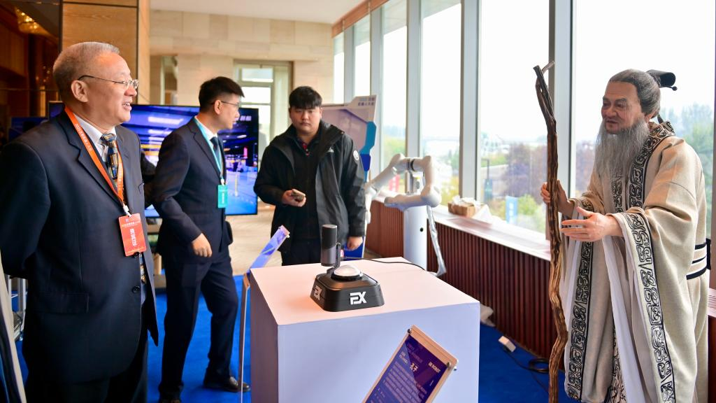 10月17日,一名參會嘉賓在瀋陽新次元人形機器人研究院有限公司展臺與交互型仿生人形機器人“孔子”互動。新華社記者 吳青昊 攝