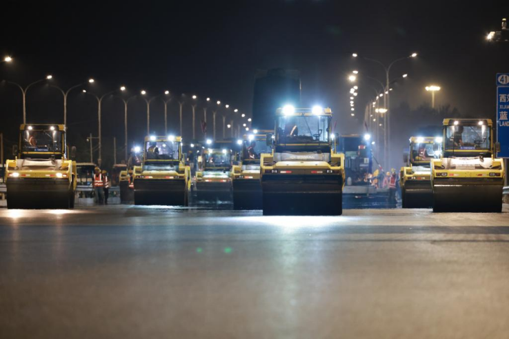 經過前期充分調研和方案論證,在夜間23點至次日5點,數百名建設者、數十臺大型機械提前集結,在強大的現場協調、施工組織能力加持下,多個作業面同步施工,無縫銜接地完成了舊路銑刨、新料攤鋪、精細順接等一整套工序。