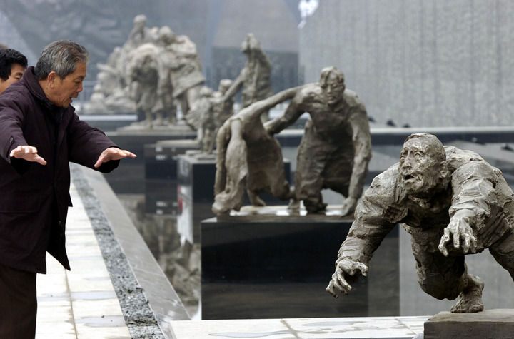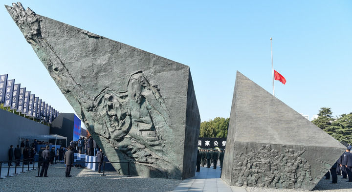 2021年12月13日,南京大屠殺死難者國家公祭儀式在南京舉行。圖片中央是雕塑《冤魂呐喊》。新華社記者 李博 攝