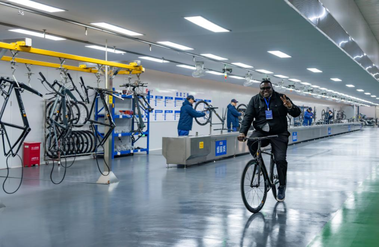 12月17日,駐華使節在吉林化纖集團試騎碳纖維自行車產品。新華社記者 傅天 攝