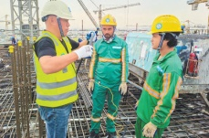 “魯班工匠計畫”是中國建築推出的一項屬地員工培訓計畫。中建中東公司在承接各項工程時,通過師帶徒和現場教學方式,開展技能實操、安全生產、理論知識等各項培訓。圖為中方員工(左一)在施工現場進行教學。