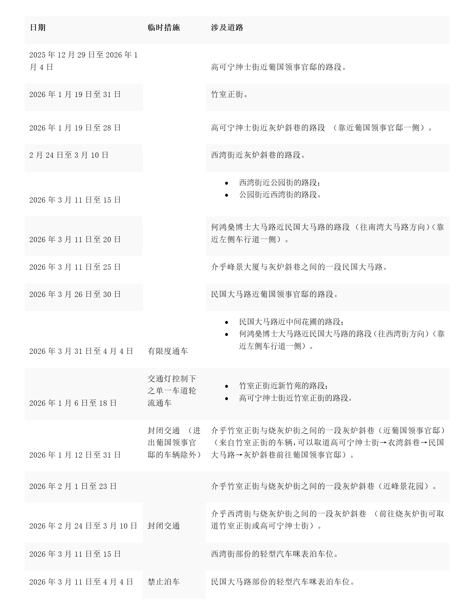 本報訊 (記者 大林)配合市政署維修下水道工程,經跨部門協調,Mtel電信公司、電力公司、澳門電訊和私人公司合併施工,以縮短工期,當中將分別進行管道鋪設和照明系統優化等工程。配合工程,竹室正街一帶於2025年12月29日起至2026年4月4日實施臨時交通措施,詳情可查閱附表。巴士服務不受影響。