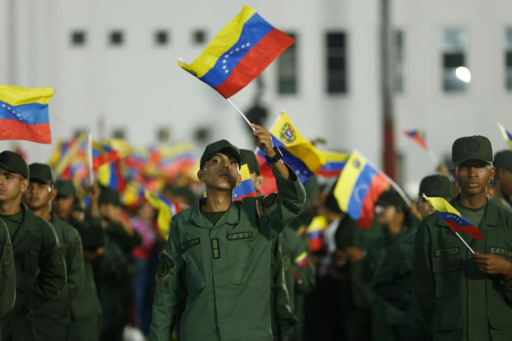 11月25日,委內瑞拉玻利瓦爾國民武裝部隊成員參加在加拉加斯舉行的遊行活動。新華社發