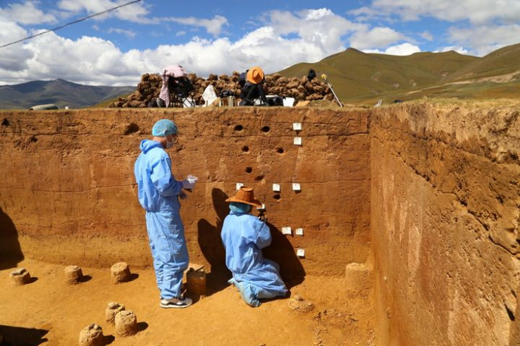 考古人員在皮洛遺址進行探方發掘(2022年7月30日攝)。新華社發(四川省文物考古研究院供圖)