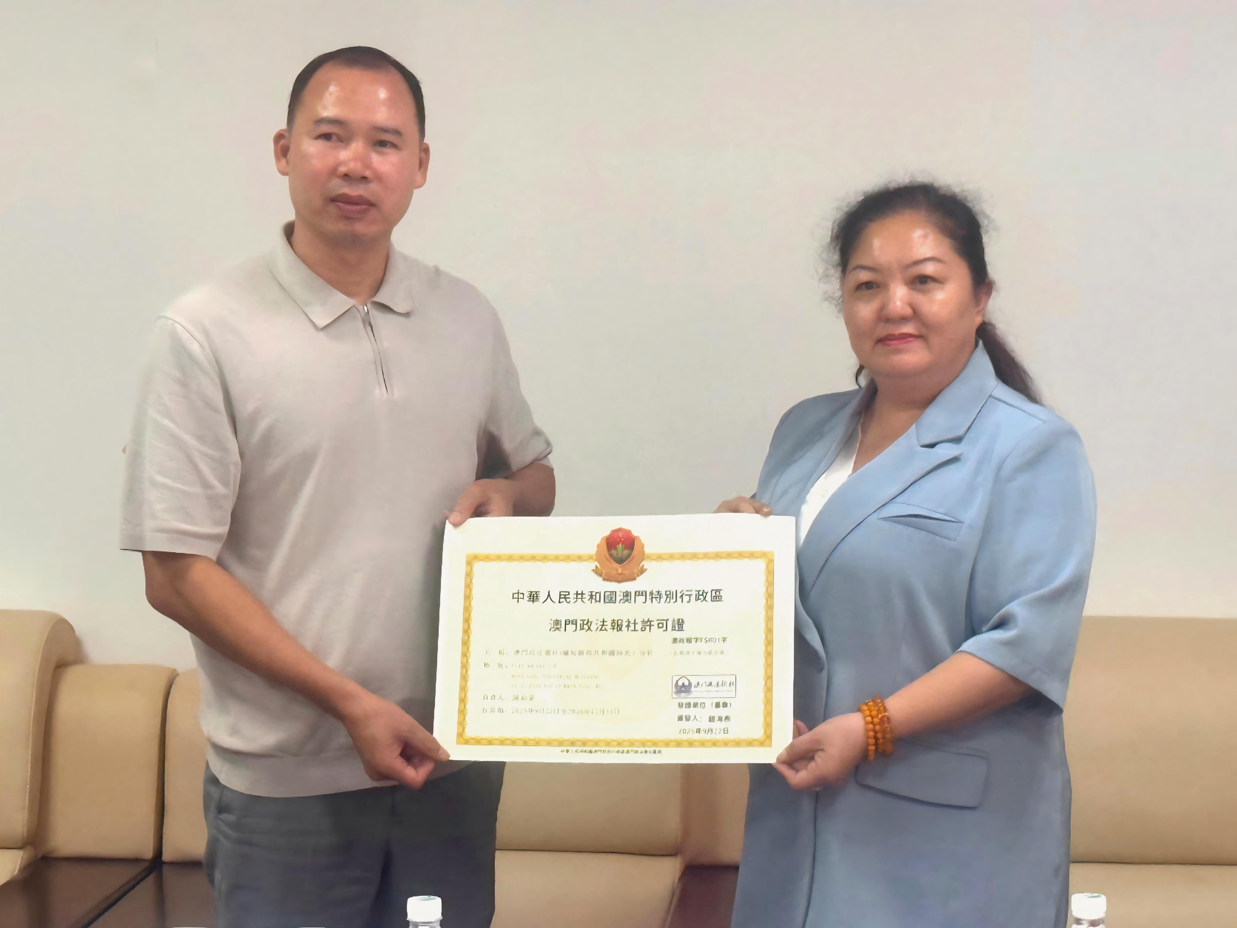 本報訊(記者 曉陽)仲秋的珠海,微風送爽。大家都沉浸在雙節前的歡樂祥和的氣氛中。9月30日,澳門政法報社社長趙海燕與同美貿易有限公司董事長陳勐豪在合作協議上簽字,標誌著澳門政法報社緬甸仰光分社正式設立。