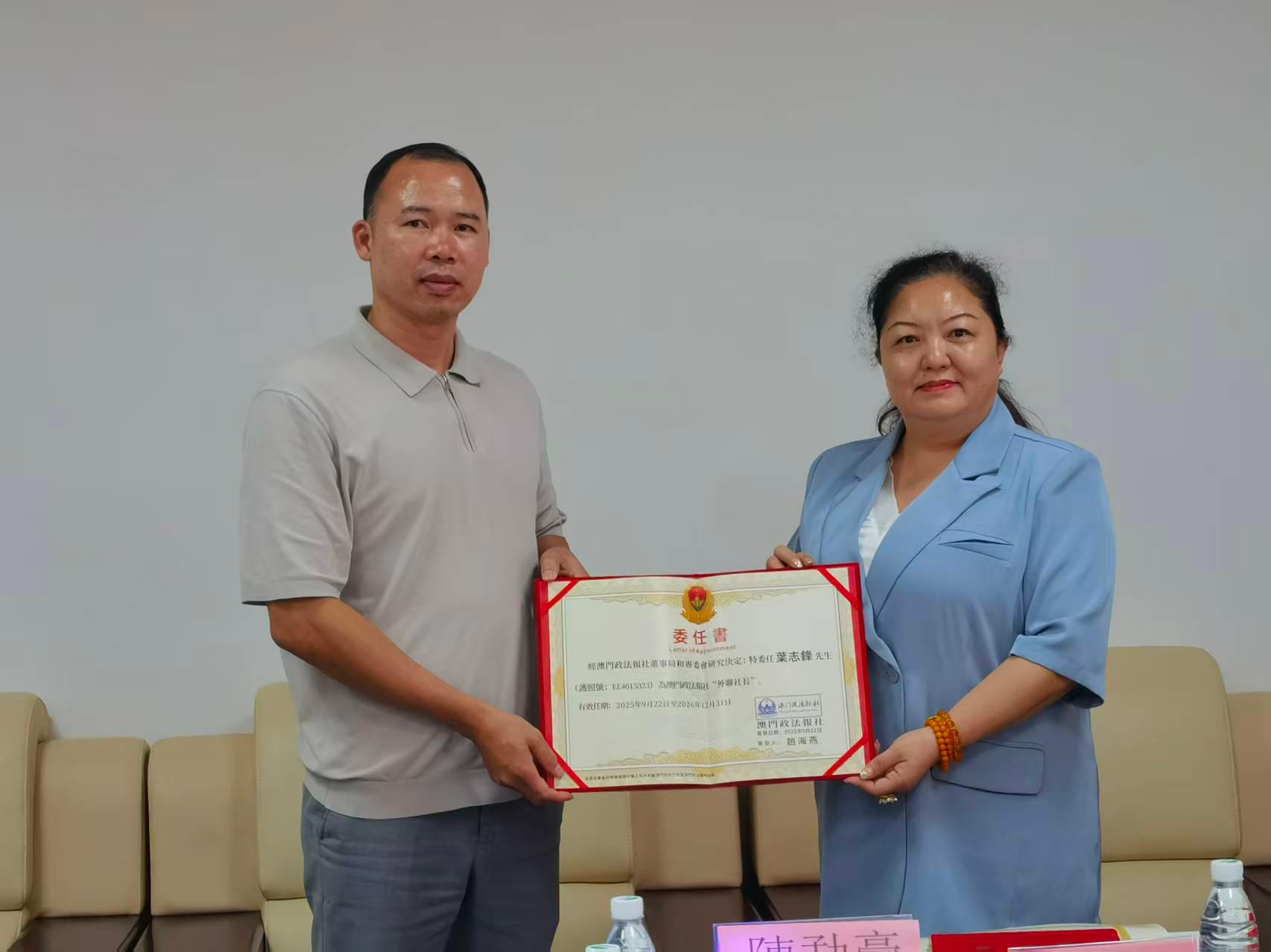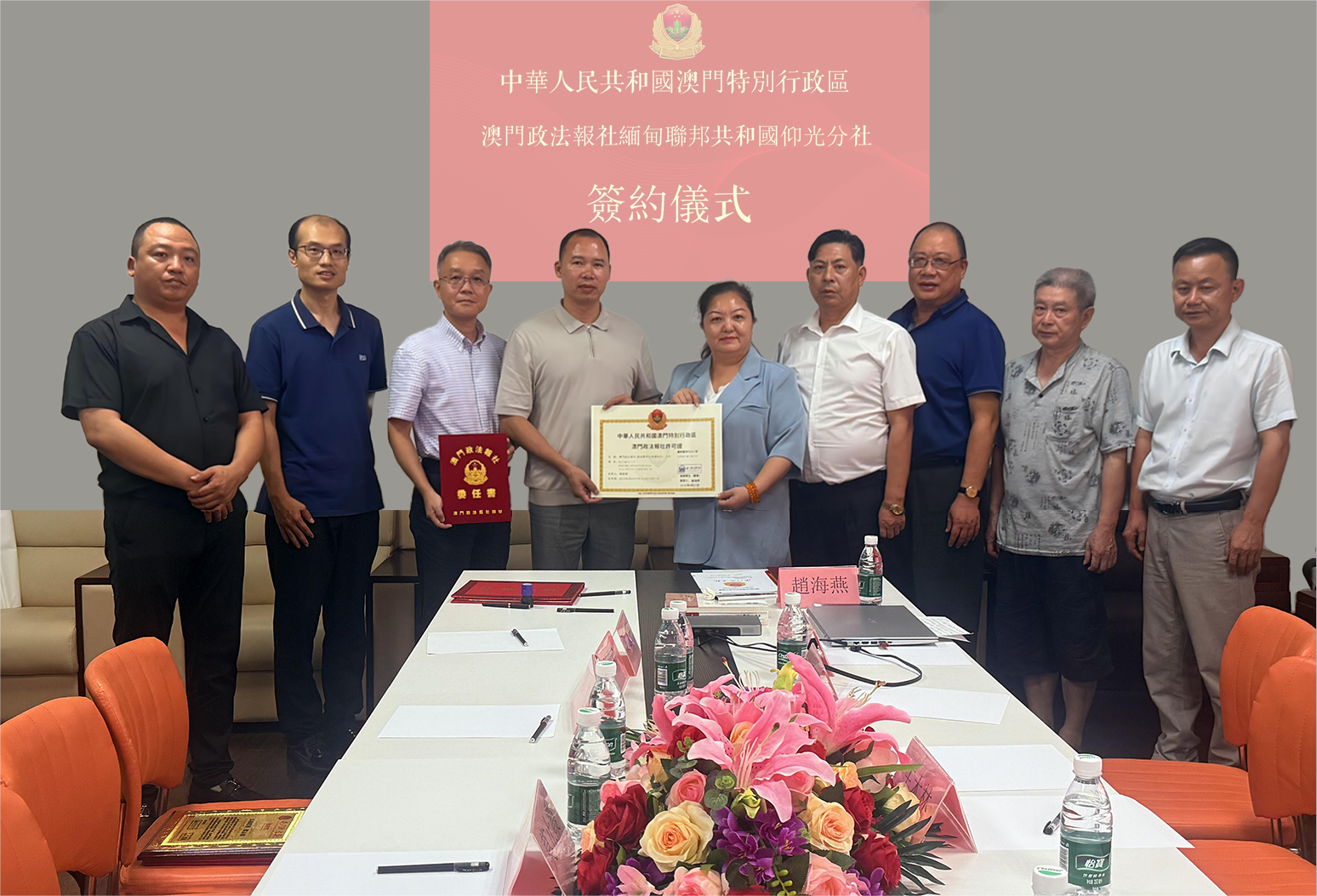 澳門政法報社董事長張國柏,外聯社長葉志鋒,副社長王立新,秘書長楊揚,辦公室主任黃和通,網路部的宗毅坤以及緬甸仰光分社郭旭等參加簽約儀式。